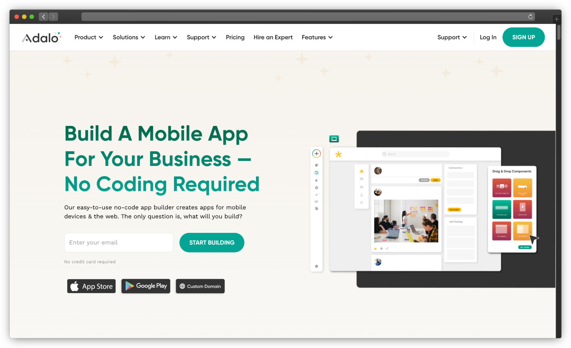 This lovable alternative focuses on simplicity. Users appreciate "over 25 beautifully designed drag and drop components" and features like "push notifications, link pages, login & permissions". It's truly no-code - "Adalo enables anyone to build an app".